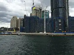 The Barangaroo area, which had been a derelict port for years, had been a long-proposed site for urban renewal. Following proposals put forward by the Sydney Harbour Foreshore Authority and reviews by the O'Farrell State Government, major construction and redevelopment at Barangaroo began in 2011.[3] In May 2013, the State Government outlined plans to build a new terminal at Barangaroo to replace Darling Harbour.[4] As well as allowing for additional services on the F3 Parramatta River route, the increased capacity will allow other routes, such as a then-envisioned potential extension of the F7 Eastern Suburbs route, to also use the new wharves.[5] It was proposed that all Sydney Ferries routes that used the Darling Harbour wharf will be rerouted to Barangaroo, with Darling Harbour to be decommissioned and handed back to private operation.[6]
