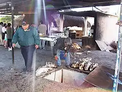The asado en barbacoa (roasting in barbacoa) was widely prepared in Mexico at countryside festivities, such as rodeos (cattle roundups), herraderos (cattle branding celebrations), jaripeos and bull-fights, patron saint festivities of the hacienda, or family picnics.[21] According to two articles published by Mexican writer Domingo Revilla in 1844 and 1845, respectively, the "banquet" at the herraderos was reduced to barbacoas and asados al pastor (spit roasting barbecues) of whole calves (veal), bull or sheep,[22] and wrote that while barbacoa was more common in the Mezquital valley -particularly from Actopan-, and Apan valleys and surrounding areas, asados al pastor were more common in Tierra Adentro or the Bajío region and beyond.[23]