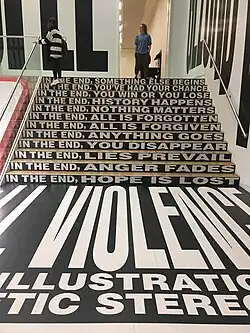 In 2007, Kruger was one of the many artists to be a part of South Korea's Incheon Women Artists' Biennale in Seoul. This marked South Korea's first women's biennial.[52] That same year, she designed "Consider This...", an exhibition at the Los Angeles County Museum of Art.[53] In September 2009, Kruger's Between Being Born and Dying, a major installation commissioned by the Lever House Art Collection, opened at the New York City architectural landmark Lever House. In 2012, as a member of the board of the Museum of Contemporary Art, Los Angeles (MOCA), Kruger volunteered to be the lead funder of the museum's scholarly exhibit Ends of the Earth: Land Art to 1974 and to create a new work on vinyl to sell, with proceeds going entirely toward the show's $1 million budget.[54] An exhibition of new and recent work from Kruger was hosted by Modern Art Oxford in 2014.[55] In 2016, as part of the celebration of the reopening of the East Building Tower Gallery following years of renovation, The National Gallery of Art created an exhibition showcasing 13 works by Barbara Kruger.[56]