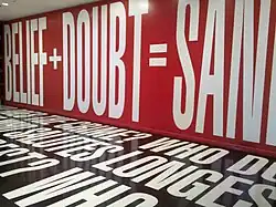 For a site-specific piece that she produced at the Parrish Art Museum in 1998, Kruger placed across the upper range of the museum's Romanesque facade stark red letters that read, "You belong here"; below, on columns separating three arched entry portals, stacked letters spelled "Money" and "Taste".[30] As part of the Venice Biennale in 2005, Kruger installed a digitally printed vinyl mural across the entire facade of the Italian pavilion, thereby dividing it into three parts—green at the left, red at the right, white in between. In English and Italian, the words "money" and "power" climbed the portico's columns; the left wall said, "Pretend things are going as planned", while "God is on my side; he told me so" filled the right.[31] In 2012, her installation Belief+Doubt, which covers 6,700 square feet (620 m2) of surface area and was printed on wallpaper-like sheets in the artist's signature colors of red, black, and white, was installed at the Hirshhorn Museum and Sculpture Garden.[32]