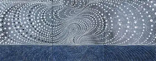 In 2010, Takenaga made two significant shifts in her work: she began incorporating a flat, linear element serving as both horizon and spatial division, and she relinquished some control, allowing chance elements and looser patterns (still dot swirls, undulating constellations and bursting whorls) to emerge in bolder compositions.[33][21][26] Critics suggest the horizon line—normally a stabilizing element—disrupted her typically ordered work, allowing a wider pictorial range to evolve that alluded to imaginary landscape and aquatic as well as galactic realms.[1][33][34]