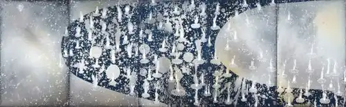 Takenaga's paintings in the shows "Outset" (2018) and "Manifold" (2019) at DC Moore Gallery employ austere, contemplative palettes (black, iridescent white, silvery gray and blue) and bolder, shifting figure-ground relationships featuring large, dark shapes like holes in the images (e.g., Aeaea; Hello).[38][39][40] Their mysterious forms draw widely—on classical Japanese art, scientific imagery and mid-century abstraction—and leave behind her fields, tarmacs and horizon lines for more confrontational, turbulent references to explosions, space travel, drifting land masses, and microbiology, evoking a world of constant pressure and relentless change.[10][8][41] Works such as the sprawling, five-panel Manifold 5 use abstracted silhouette imagery (a river, clouds, robes, elephants, votive candles, geyser forms) taken from Japanese screens and other Eastern sources; they function as patterns or dark grounds flipping between positive shapes and negative space.[8][10][41] The contrasting Serrulata (in translation, cherry tree) layers and presses together multiple processes—patterns, pours, Sumi ink-like splotches, and drips of dark blue, black and gray—creating patterns on a shell pink ground to suggest cherry blossoms and themes of disruption, dispersal, decay and transience.[10][8]