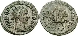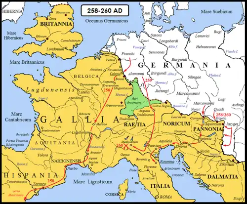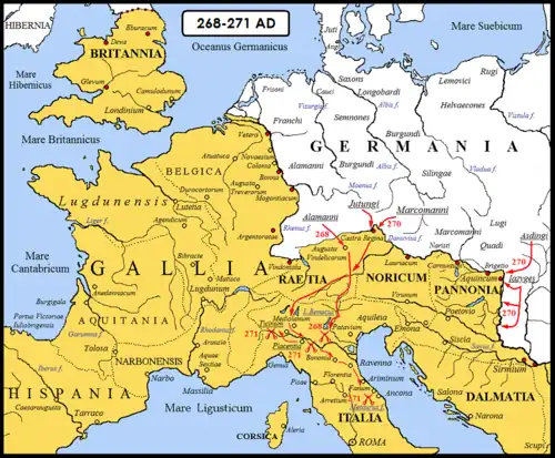 It was also thanks to the subsequent internal and provisional division of the Roman state into three parts (to the west the Empire of Gaul, in the center Italy, Illyricum and African provinces, and to the east the Kingdom of Palmyra) that the Empire managed to save itself from ultimate collapse and dismemberment. However, it was only after the death of Gallienus (268) that a group of emperor-soldiers of Illyrian origin (Claudius the Gothic, Aurelian, and Marcus Aurelius Probus) finally succeeded in reunifying the Empire into a single bloc, even though the civil wars that had been going on for about fifty years and the barbarian invasions had forced the Romans to give up both the region of the Agri decumates (left to the Alemanni in about 260) and the province of Dacia (256-271), which had been subjected to incursions by the Dacian population of the Carpi, the Tervingi Goths, and the Iazigi Sarmatians.[5]