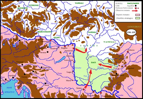 - Maximinus Thrax, once the Germanic-Rhaetic sector was pacified, led new campaigns against the Iazigi Sarmatians of the Tisza plain, who had tried to cross the Danube after about fifty years of peace along their borders. He had a dream: that of emulating the great Marcus Aurelius and conquering free Germania Magna.[68] His headquarters were placed at Sirmium, in the center of the Lower Pannonian and Dacian front. Historia Augusta reports thus:
