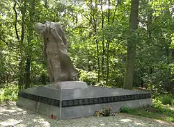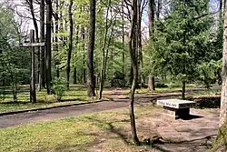 Initially, modest obelisks commemorated the execution site in the Barbarka forest.[138] A memorial plaque was also placed on the so-called "death wall" at Fort VII.[139] On 28 October 2009, a new monument to honor the victims was unveiled in Barbarka, designed by Marian Molenda. At the same time, the area around the monument was developed.[138] Currently, the monument-cemetery complex in Barbarka includes:[140]