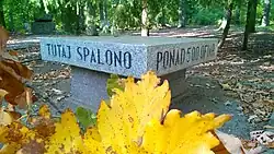 In the second half of 1944, as the Red Army approached, the Germans attempted to erase all traces of the crimes. In Barbarka, a network of guard posts was established, and signs with inscriptions in German and Polish were set up, prohibiting local residents from entering the forest under the threat of death.[134] Almost all mass graves were opened, and the bodies buried in them were exhumed and burned.[135]
