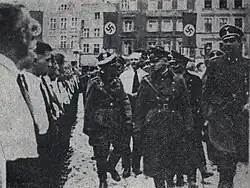 In 1939, Toruń was inhabited by 2,568 people of German nationality, which constituted 3.2% of the city's population.[22] Toruń played an important role in the life of the German minority in Pomerania,[23] hosting, among others, one of the branches of the Nazi Party in Poland (Landesgruppe NSDAP – Polen).[24] In the autumn of 1939, many local Volksdeutsche actively engaged in establishing the occupational order. Already on September 8, the day after the city was occupied by the Wehrmacht, an auxiliary police force composed of local Germans (Hilfspolizei) was organized. In the second half of September, its members joined the ranks of the Selbstschutz, a police-like formation composed of Volksdeutsche, which Reichsführer-SS Heinrich Himmler ordered to organize in the occupied Polish territories. The position of leader of the Selbstschutz for the city of Toruń and Toruń County (Kreisführer) was assumed by SS-Sturmbannführer Helmut Kurt Zaporowicz,[note 2] while the structures of the "Self-Defense" in Toruń itself were led by Stadtführer Rudolf Preuss (a local German, industrialist). Organizational-wise, the Toruń Selbstschutz was subordinated to the II Inspectorate of Selbstschutz, headquartered in Płutowo, covering the counties of Chełmno, Grudziądz, Lipno, Toruń, and Wąbrzeźno in terms of its operations. The position of inspectorate chief was held by SS-Standartenführer Ludolf Jakob von Alvensleben.[note 3][25]