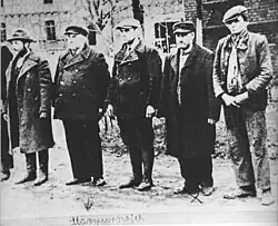 Initially, the internees remained under the supervision of the Wehrmacht.[58] However, the SS and the police had unlimited access to the camp.[67] On October 26, concurrently with the abolition of military administration, Fort VII was officially taken over by the Selbstschutz.[67] The camp commander was Karl Friedrich Strauss, a local German and a carpenter, while his deputy was Bronisław (Bruno) Schönborn.[68][69] Additionally, the camp staff included individuals such as Wiese (a baker by profession), Karst, Denni Deter, Hoffenicz, Broese, Betinger, Schulz, Heise, and Tobar.[70]