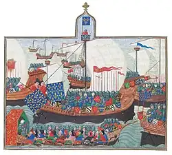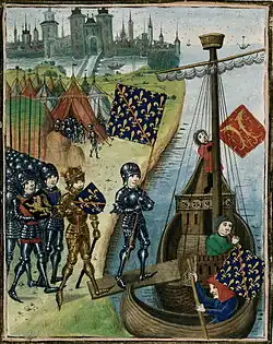 ![]() The French army disembarking in Africa, led by the Duke of Bourbon, holding a shield bearing the royal arms of France (15th century miniature) | |||||||||