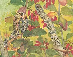There are two generations per year, as this species is bivoltine. Adults emerge from May to June and again in August. The second generation pupate in the ground approximately at the end of September. The pupa overwinters. The larvae feed on barberry shrubs (Berberis) from July to October.[4]