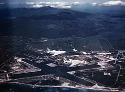 The Navy acquired the airfield in early 1943. At that time it consisted of two short runways and four hangars that were just two feet above hightide.[3] A PNAB civilian contractor started work by bringing a dredge onto Keehi lagoon in February 1943.[3] In April the military took over. The Army took over the dredging operation while Seabees of the 5th Naval Construction Battalion took over the airfield.[3] When they were done there would be three runways. The Navy would turn the airfield into a major facility by sending Seabees from the 13th, 64th and 133rd Construction Battalions to do it.[3]