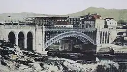 At the beginning of the 20th century, work began on the central metal arch. The bridge was inaugurated on 3 July 1905.[6] It had an arch with a span of 75 metres (246 ft), resting on two solid masonry supports, and three arches on each side, in which ornamental motifs in the Gothic style, in the taste of the time, were carved.[2] On the eve of the inauguration, load tests were carried out, putting 200 tonnes (200 long tons; 220 short tons) under static load and 13 carriages of 4 tonnes (3.9 long tons; 4.4 short tons) each under dynamic load.