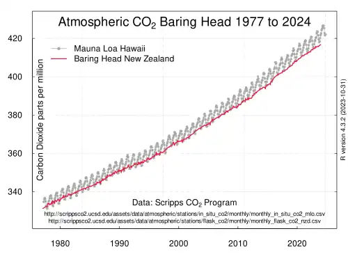 - ^ Keeling, R.F., S.C. Piper, A.F. Bollenbacher and J.S. Walker. 2008. Atmospheric Carbon Dioxide Record from Baring Head New Zealand, Archived 28 May 2010 at the Wayback Machine Atmospheric CO2 records from sites in the SIO air sampling network. In Trends: A Compendium of Data on Global Change. Carbon Dioxide Information Analysis Center, Oak Ridge National Laboratory, U.S. Department of Energy, Oak Ridge, Tenn., U.S.A.
