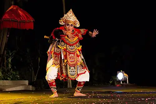 Baris dance (Balinese: ᬩᬭᬶᬲ᭄, igélan baris) is a family of traditional war dances in Bali, Indonesia, accompanied by gamelan, in which dancers depict the feelings of a young warrior prior to battle, glorify the manhood of the triumphant Balinese warrior, and display the sublimity of his commanding presence. Baris derives its name from the word bebarisan, which literally means "line" or "file formation", referring to the soldiers who served the ancient rajas of Bali.[1]