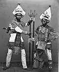 Among these dances is the baris demang, which dates back to the 19th century (a drawing of a performance was acquired by Herman Neubronner van der Tuuk while in Bali). In such a dance, dancers wear costumes similar to those worn by the demang in gambuh performances and carry wooden knives. This dance is usually performed during the Pemayun ritual.[2]