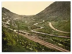 Barnesmore Gap (Irish: An Bearnas Mór, meaning 'the big gap') is a mountain pass or gap (elevation 117 m) situated in the Bluestack Mountains, County Donegal, Ireland. The main Donegal to Ballybofey road, the N15, and route of the former County Donegal Railway run through Barnesmore gap, acting as the main route between south and north Donegal. It is an area of complex geology, but its main feature is granite formed in the Devonian period, 400million years ago. The gap held glaciers in the Last Glacial Period flowing to the Atlantic through what is now Donegal Bay, up to about 13000 years ago.54°43′19″N 7°56′53″W / 54.72208°N 7.94812°W[1] According to a 17th century Hiberno-Latin history of Donegal Abbey, the Gap of Barnesmore was once home to a large population of wild red deer.[2]