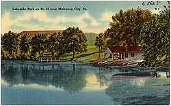 Barnesville is quite unique in that it was the home to two swimming lake/amusement parks. In 1880, Lakeside Park opened with two dams and a picnic ground. With easy access by train it became an entertainment center with a large hotel on the grounds, bathing houses bordering the lake, and cottages on the water. A roller-coaster was erected on the site in 1923 and other amusement rides were added. Finally a large ballroom was constructed. In 1916, competition came in the form of a new park a mile away—Lakewood.