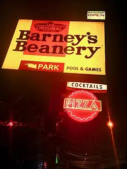 Barney's Beanery is a chain of gastropubs in the Greater Los Angeles Area. John "Barney" Anthony founded it in 1920 in Berkeley, California, and in 1927 he moved it to U.S. Route 66, now Santa Monica Boulevard (State Route 2), in West Hollywood.[1] As of 2011, Barney's Beanery had locations in Burbank, Pasadena (taking the ground floor of Q's Billiards at 99 East Colorado Boulevard), Santa Monica, Westwood, Redondo Beach at the Redondo Beach Pier and the original in West Hollywood.[2]