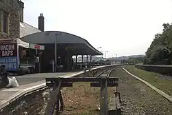 The station building contains the ticket office, toilets, café and a cycle hire office.[16][12] The platform is long enough for an 11-coach train. There is just a single track in use (the second platform is derelict) but there is a siding with a loop line just south of the platform.[1] The ticket office is usually open every day and a ticket machine is also provided. There is both a car park and bicycle rack.[18]