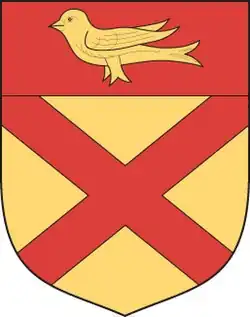 The heraldic blazon for the coat of arms of the family is: Or, a saltire gules, on a chief of the last a martlet of the field.