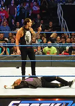 At the 2016 WWE draft on July 19, Corbin was drafted to the SmackDown brand.[58] After Apollo Crews earned a match for the Intercontinental Championship by defeating Corbin and Kalisto in a triple threat match,[59] Corbin repeatedly assaulted Kalisto (who had been pinned in the match), eventually putting him out of action with a (kayfabe) injury.[60] He defeated Crews at the Backlash pre-show on September 11.[61] At No Mercy on October 9, he defeated Jack Swagger[62] as well on the October 18 episode of SmackDown.[63] On the November 8 episode of SmackDown, the returning Kalisto attacked Corbin, causing a (kayfabe) injury and forcing Corbin to drop out of SmackDown's Survivor Series team.[64] After retaliating by costing Kalisto the Cruiserweight Championship at Survivor Series,[65] Kalisto attacked Corbin with a chair during a match on the November 22 episode of SmackDown,[66] leading to a chairs match between the two at TLC: Tables, Ladders & Chairs on December 4,[67] which Corbin won.[68]