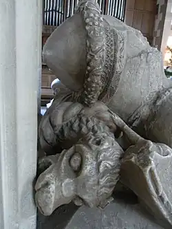 Crest of Harington, as sculpted on helmet of effigy of John Harington, 4th Baron Harington(d.1418), Porlock Church, Somerset: A lion's head erased or collared gules [2]