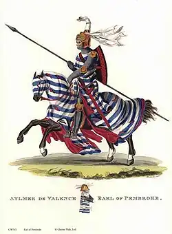 Aymer was the son of William de Valence, son of Hugh X of Lusignan, and Isabella of Angoulême.[1] William was Henry III's half-brother through his mother's prior marriage to King John, and as such gained a central position in the Kingdom of England.[2] He had come to the earldom of Pembroke through his marriage to Joan de Munchensi, granddaughter of William Marshal.[1] Aymer was the third son of his family, so little is known of his birth and early years. He is believed to have been born some time between 1270 and 1275.[3] As his father was on crusade with Lord Edward until January 1273, a date towards the end of this period is more likely.[4] The later date is problematic, however, because his mother by then was in her mid-forties. With the death in battle in Wales of his remaining brother William in 1282 (John, the elder brother, was dead in 1277), Aymer found himself heir to the earldom of Pembroke.[4] He married Béatrice, daughter of Raoul II of Clermont, sometime before October 1295.[5]