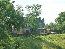 Most baronies had a water mill which was under the control of the laird or lord and to which the tenants were thirled or obliged to go to have their grain ground into flour. A proportion of the grain was taken as payment. Thirlage ended in the late 18th century and resulted in a number of mills being abandoned once market forces took a hold. Kersland Mill on the Powgree Burn lies just downstream of the Tianna Falls in the Kersland Glen and is recorded on Timothy Pont's map c. 1604.[7] Robert Spier, writer and bank agent in Beith was descended from the Spier's of Kersland Mill which he purchased from his elder brother.[10] In 1852 Captain John Russell of Maulside acquired Kersland Mill and the mill lands.[11]