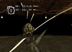 The game's characters were designed by Hyōju Mū.[44] The character models and CGI sections were created by American CGI production studio Inertia Pictures, while the game's CGI design was led by Eisaku Kitō.[34][45] Inertia Pictures was brought on by Yonemitsu to give the game a unique aesthetic, with Inertia Pictures quickly understanding his vision and agreeing to collaborate. Communicating with Inertia Pictures caused some issues due to the time zone and language differences.[34] Kitō began his work on the project in mid-1995. Due to the tower interior's aesthetic, Kitō created a recurring "uterus" aesthetic when designing the enemies, treating them as microorganisms infecting a womb.[45] Kitō's main design inspiration was the work of Philip Dexsay on the 1992 Winter Olympics opening ceremony. The use of angels and presence of the Absolute God were not intended to directly reference any religion, but came about due to Yonemitsu's interest in their imagery and roles. The enemy character designs were themed after tarot cards.[34]