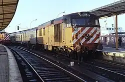 In 1941, several carriages produced by the American factory Budd, that used a new construction technique called tubular design, were assembled at Barreiro.[78] In 1943, extension and remodeling works were carried out.[3] Between June and August 1945, several steam locomotives using diesel instead of coal arrived by ship, which were quickly assembled in the Santa Apolónia and Barreiro workshops, as they were urgently needed due to the coal shortage at that time.[79]