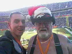 Barrel Man, real name Tim McKernan (September 5, 1940 – December 5, 2009),[1] was a superfan of the Denver Broncos. In all types of weather for 30 years, he attended every home game at both Mile High Stadium and INVESCO Field at Mile High wearing nothing but an orange barrel that covered his torso and a cowboy hat and boots. His costume was reminiscent of rodeo clowns (or barrelmen) who serve as a distraction to animals in the rodeo arena in order to protect riders who have been thrown and of the stereotype of the miner who lost his stake and had nothing left to wear but a barrel. He was the first Broncos fan inducted into the VISA Hall of Fans[2][3] at the Pro Football Hall of Fame.[4][5]