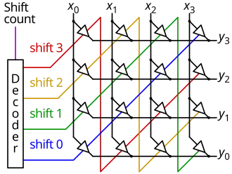 The very fastest shifters are implemented as full crossbars, in a manner similar to the 4-bit shifter depicted above, only larger. These incur the least delay, with the output always a single gate delay behind the input to be shifted (after allowing the small time needed for the shift count decoder to settle; this penalty is only incurred when the shift count changes). These crossbar shifters require however n2 gates for n-bit shifts. Because of this, the barrel shifter is often implemented as a cascade of parallel 2×1 multiplexers instead, which allows a large reduction in gate count, now growing only with n log n; the propagation delay is larger, growing with log n (instead of being constant as with the crossbar shifter).