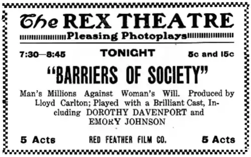 - ^ "REX - The latest Red Feather release. Barriers of Society". The Seattle Star. October 12, 1916. p. 3. Retrieved March 17, 2021 – via Newspapers.com.