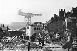 The difficulty of solely targeting Barrow's shipyard meant that many residential neighbourhoods were bombed instead; 83 civilians were killed, 330 injured, and over 10,000 houses were damaged or destroyed during the Blitz, about 25 percent of the town's housing stock.[7] Surrounding towns and villages were often mistaken for Barrow and were attacked instead, while many streets in Barrow were severely damaged. Bombing during mid-April 1941 caused significant damage to a central portion of Abbey Road, completely destroying the Waverley Hotel as well as Christ Church and the Abbey Road Baptist Church. The town's main public baths and Essoldo Theatre were also severely damaged, however they were repaired within years.[8] Hawcoat Lane is a street that is most noted for taking a direct destructive hit in early May 1941.[7] Barrow has been described as somewhat unprepared for the Blitz, as there were only enough public shelters for 5 percent of the town's population; some people who lived in the town centre were even forced to seek refuge in hedgerows on the outskirts of Barrow. This shortage of shelters was believed to have led to excessively high casualties.[7] Two fire watchers were killed in May 1941 when the hammer head crane they were stationed in at Vickers Shipyard was bombed by the Luftwaffe.[9]