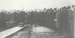 In 1883 a group of mine owners applied for parliamentary permission to build a dock at Barry and a new railway to serve it.[6] Barry Sound was a natural choice for the dock site since comparatively little excavation was needed.[11] David Davies and John Cory were spokesmen for the group.[7] Davies, son of a small farmer in Montgomeryshire, was the founder of the Ocean Coal Company.[12] He was the leader of the Rhondda mine owners, and was already experienced in railway construction.[13] Cory was establishing a network of coal bunkering depots around the world.[12] At first rejected, the group won permission for the port and railway in August 1884.[6] On 14 November 1884 a group of ship and mine owners "trudged out to Castleland Point—near the later Dock Offices—to dig a small hole in the ground with the aid of a ceremonial spade, a wheelbarrow and a plentiful supply of planking to keep the autumn mud off their shoes."[14]