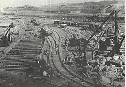 The dock layout that was originally planned – including the site of the basin entrance and passage – was adjusted as the work progressed to ensure that the foundations rested on hard rock.[28] After the tide had been excluded, pits and borings were made to determine the nature of the bottom. A much narrower dock had been planned, but it was decided to move the south wall further south. A mole was added running along the middle of the dock, which increased the length of the quays.[28] Thirty locomotives were used inside the dock works to carry materials. At its peak there were 3,000 workers on the construction site. In the summer and autumn the work continued day and night, with the site lit by electricity and Wells lights.[20]