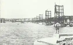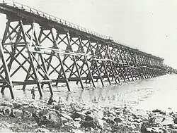 The western dam caused much more trouble, since it rested on mud that varied in depth to upwards of 40 feet (12 m). The ends of the dam were formed by tipping earth from wagons run out from the mainland and the island. In the centre, the earth sank into the deep mud and slid away with it. A viaduct of timber piles was built across the gap, to carry loaded trucks from which the earth was thrown out. As the ends approached each other, the tide current was too fast. The contractor twice tried to close the gap with earth at low-water neap tide, but each time the water broke through to make a gap 80 feet (24 m) wide, through which the tide poured at 5 miles per hour (8.0 km/h).[18]
