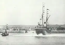 The civil engineer John Wolfe Barry reported that the docks were nearing completion in September 1888.[5] A caisson[b] was built at the sea face of the entrance within the temporary stone dam, fitting against the quoins of the entrance. The stone dam was removed before all the work was completed.[20] Water was let into the docks on 29 June 1889. The water was first admitted into the basin and dock by opening the sluices in the culvert at the entrance on a rising tide. The sluices in the culvert at the west end were also opened. On the first tide the basin and dock were covered with 5 feet (1.5 m) of water, on the next with 18 feet (5.5 m), and on the tide that followed with 23 feet (7.0 m).[20] On 13 July 1889 the caisson was floated and taken into the basin by a tug, and the tide could flow freely through the entrance.[30] The ceremonial opening by Mrs Lewis Davis of Ferndale and David Davies, with 2,000 guests, took place on 18 July 1889.[31][32] The first vessel, SS Arno, sailed into the dock shortly after the ribbon was cut. Six tips were ready for the opening, and loaded coal into six ships.[33]