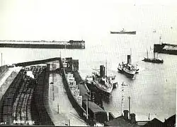 The No.2 dock, (often referred to as the "New dock") to the east of No.1 dock, was open and in use by 1898.[36] The first ship to enter No.2 dock was SS Solent when it opened without ceremony on 10 October 1898.[52] John Jackson, a veteran of several major dock and harbour projects including the piers and foundation for Tower Bridge, London, the new Dover Harbour and part of the Manchester Ship Canal, was the contractor for the expansion.[53] No.2 Dock is 3,338 feet (1,017 m) long and 400 to 600 feet (120 to 180 m) wide, connected to No.1 dock via a narrowing channel from west to east, It was latterly bridged by a hydraulically operated road/rail swingbridge; this was removed after 1999. Dock walls 46.5 feet (14.2 m) high were built of large limestone blocks at the loading points. The tall hydraulic hoists have since been demolished.[7]