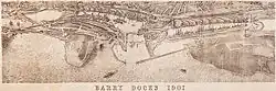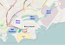 The No.1 dock, the first dock built, is 3,400 by 1,100 feet (1,040 by 340 m) and covers about 70 acres (28 ha).[32] Its western end is divided into two arms by a projecting mole.[5] No. 1 dock has a full width of 1,600 feet (490 m) at the eastern end, so the largest vessels could swing even when the tips and quays were fully occupied.[49] There was a 700 by 100 feet (213 by 30 m) graving dock (dry-dock) at the northeast corner but, due to the Waterfront development in the 1990s, this has been filled in.[5] This commercial graving dock was capable of handling the largest vessels of the day.[50] In 1893, to the east of this, there was a timber pond of 24 acres (9.7 ha) connected to the No.1 dock by a short channel almost parallel with the then dry-dock. This link was later severed and part of its length converted to another dry-dock, with the pond beyond filled in to make way for the necessary high-level rail viaducts and embankments run to the No.2 dock coal hoists. The remaining dry-dock, minus its floatable caisson, is still flooded with the waterline commoned with that of the two docks (July 2017). By 1901, with No.2 dock in use, a second timber pond was included north of the dock. It was partly backfilled after 1960 but intersected by the docks road level crossing (Wimborne Rd) from Cadoxton to the Bendricks. This is a single line rail freight link from Network Rail's Cadoxton station to the No.2 docks quays and southside rail infrastructure. It includes a 180° curve from northwest to the southeast side of the dock, this now being the only rail access to the entire docks area. It serves remaining sidings for the Sully Moors industrial complex, Dow Corning silicone plant, and intermodal rail freight traffic (2017).[5]