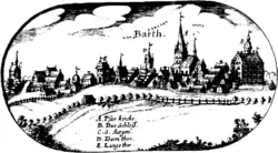 In 1627, during the Thirty Years' War, Albrecht von Wallenstein's imperial army entered Protestant Pomerania and, after they were repelled from Barth, re-took the town and exacted revenge. Before the Swedish forces entered Barth in 1630, retreating imperial troops led by Maritzen looted the town. As the war went on, some women convicted as witches were burned in the town between 1645 and 1653, three had already been burned in 1611.[4]