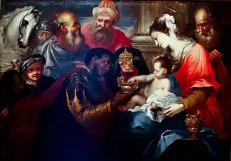 Bisciano later follows Valerio Castello and in addition to the characteristic colors, which became smoky and sfatti he adopted the type of procacciniano-corrugated figure. This is also visible in his Adoration of the Magi, preserved in the National Gallery of Palazzo Spinola in Genoa. The last works of Bisciano, before his young death from plague, were the three paintings preserved in the Dresden Gallery and depicting Christ and the Adulteress, Presentation at the Temple and Adoration of the Magi. A sketch of the central part of the latter painting is preserved in M. Labò collection in Genoa and another in the National Gallery of Palazzo Spinola. In these works the painter could almost achieve a personal style.[2]