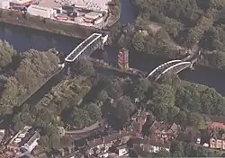 Featured in the last scene of the 1961 film A Taste of Honey, the Barton Aqueduct and Swing Bridge are seen as the character of Tom sails away. In the film's opening scenes of street life in Salford, two young children are seen playing. One of them, the 5-year-old Hazel Blears, grew up to become the Member of Parliament for Salford and a Cabinet Minister.[12] Whilst the Barton Swing Bridge does feature in the 1961 film A Taste of Honey, the scene featuring Tom the sailor on the rotating bridge is in fact the Trafford Road Swing Bridge – in the background of the shot the now demolished Henshaw's Blind Asylum can be seen as the bridge turntable shifts.[13][14]