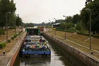 Among the now non-existent structures is a steel bridge that once existed at the lock; it was destroyed during wartime operations and not rebuilt, with a footbridge constructed in its place in 2004.[2][7]