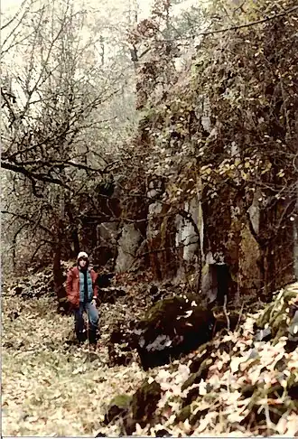 ![]() Basalt quarry on south bank of Gee Creek. Depicted individual is unidentified. Basalt Cobblestone Quarries District, Ridgefield National Wildlife Refuge, Ridgefield, Washington, United States. | |