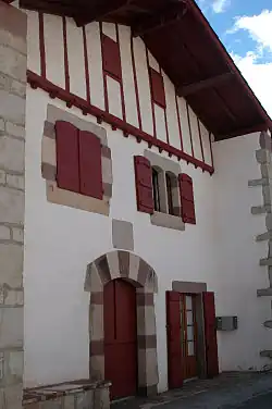 A baserri (Basque pronunciation: [bas̺eri]; Spanish: caserío vasco; French: maison basque) is a traditional half-timbered or stone-built type of housebarn farmhouse found in the Basque Country in northern Spain and Southwestern France. The baserris, with their gently sloping roofs and entrance portals, are highly characteristic of the region and form a vital part in traditional Basque societal structures.[1] They are also seen to have played an important role in protecting the Basque language[2] in periods of persecution by providing the language with a very dispersed but substantial speaker base.