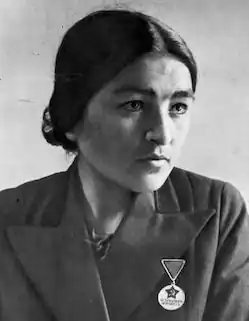 In 1937 she graduated from training to be an assistant steam locomotive driver. Before studying to become a lead locomotive driver, Lazar Kaganovich urged women to train to drive steam locomotives, so she trained alongside 26 other women railway workers in Central Asia who entered the training to become a railway driver.[6][7] In 1939 she drove a steam locomotive as the lead driver for the first time.[8] Soon thereafter she created a women’s locomotive brigade to support the war effort during World War II.[9] During the war, she drove deliveries of supplies from the Uzbek SSR to the frontlines. One time on 21 December 1941 she drove a steam locomotive carrying a delegation to visit Uzbek soldiers on the frontlines, which included Chairman of the Uzbek SSR Yuldash Akhunbabaev. On 11 April 1943 she represented Uzbek women at a rally of mothers and wives of combat soldiers. Just one day before the end of the war, her husband was killed.[10]