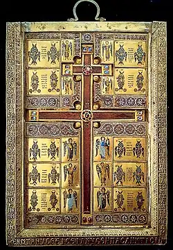 His enormous wealth enabled Basil to become, according to the Oxford Dictionary of Byzantium, "one of the most lavish Byzantine art patrons". Several of the objets d'art he commissioned have survived, including a reliquary of the head of Saint Symeon the Stylite at Camaldoli in Italy, a yellow jasper paten and a chalice at St. Mark's Basilica in Venice, and a well-known enamelled cross reliquary (staurotheke) at Limburg Cathedral in Germany.[2][12] Another reliquary containing the head of Stephen the Protomartyr was held at a Franciscan monastery in Heraklion, and was described in 1628 by the missionary Alexander Basilopoulos.[13] According to Vitalien Laurent, these items share similar characteristics in their rich and high-quality decoration, and the relatively lengthy verse dedicatory inscriptions that accompany them. They were probably all dedications to the Monastery of Saint Basil in Constantinople, whose treasures were later pillaged by Basil II.[14] Three manuscripts commissioned by him also survive, all written in high-quality parchment: a collection of Taktika, including his own treatise on naval warfare, now in the Biblioteca Ambrosiana in Milan; the homilies of John Chrysostom, in the Dionysiou Monastery of Mount Athos, Greece; and a Gospel with the Pauline epistles preceded by a fine book epigram dedicated to Basil now in Saint Petersburg.[2] He is also the likely patron of the Joshua Roll (BAV, Pal. Gr. 431) an illuminated scroll of the Old Testament book of Joshua.[15]
