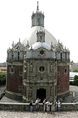 Temple located near the eastern slope of the Tepeyac hill. It was built from 1777 to 1791 and designed by the architect Francisco Guerrero y Torres.[9] It was built on a well of water considered miraculous, so pilgrimages to the place soon began. A large number of sick people drank and washed their wounds on the same site, so it soon became a focus of infections. To control the epidemics, direct access to the well was prevented and a simple roof was built, but the pilgrimages continued. By 1777 the decision was made to build a temple on the site.