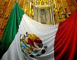 In 1904 the collegiate church was elevated to the rank of basilica.[9] Just after the Mexican Revolution and half-a-decade before the Cristero War, on the morning of Nov. 14, 1921, a bomb exploded at the main altar. The bomb was hidden inside a flower arrangement and placed in front of the image by Luciano Perez Carpio, an employee of the Private Secretariat of the Presidency.[10] Around 10:30 in the morning it exploded causing damage to the steps of the altar and some more damage to the stained glass windows. Nothing happened to the original image of the Virgin, only to a crucifix which was bent and which is said to have protected the image of the Virgin.[11] Repairs to the altar resulted in the image being placed one meter higher.